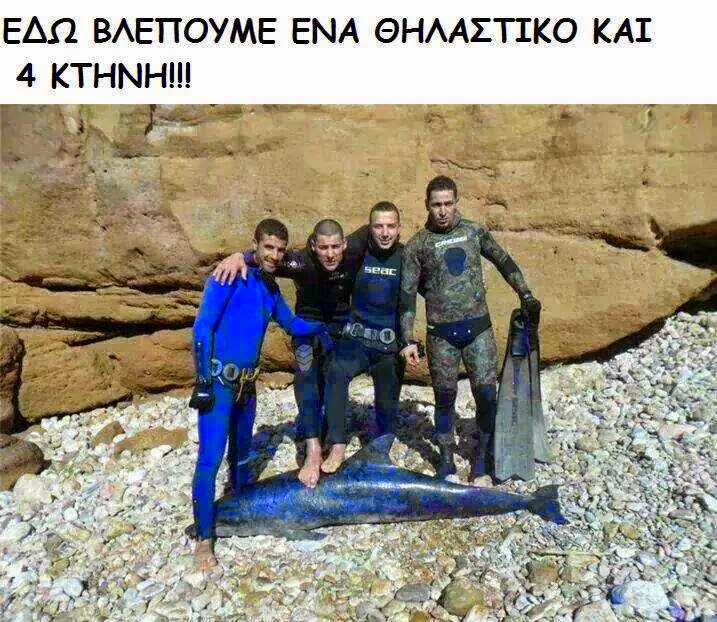 Αυτή η εικόνα απεικονίζει τέσσερις από πέντε άνδρες που σκότωσαν ένα δελφίνι και οι οποίοι παρουσιάζουν το «κατόρθωμά» τους και το άψυχο ζώο σαν τρόπαιο.